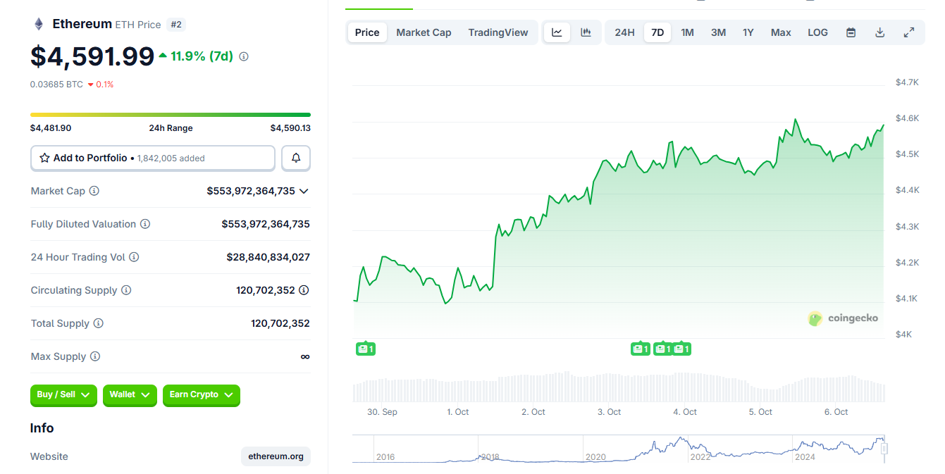 ETH traded at $4,573.13 as of October 6, still awaiting a breakout. ETH expects a higher price range above $6,000 based on bullish predictions. However, short-term trading may cause a crash to $4,100 or lower.