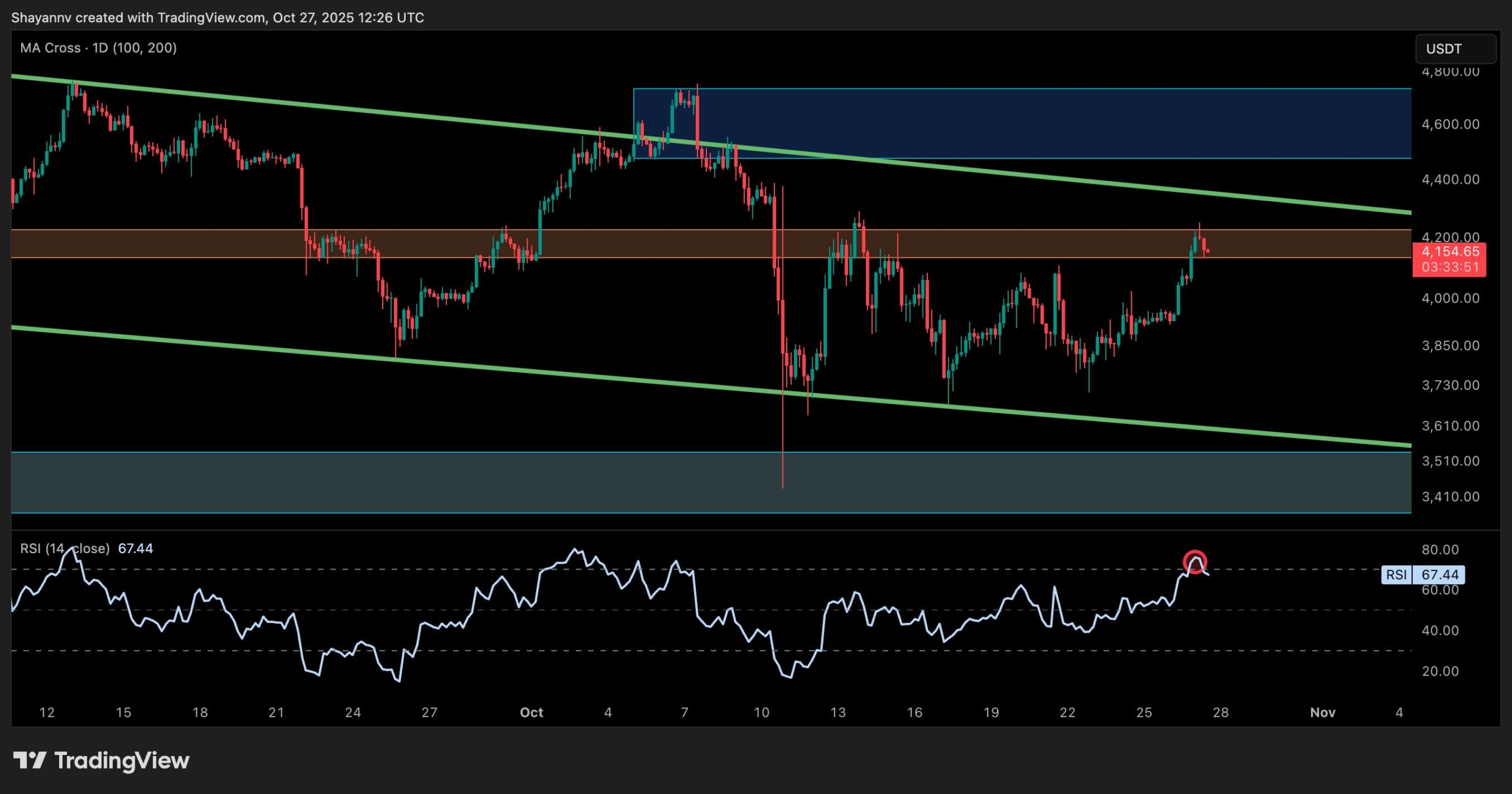 Ethereum is showing signs of strength again as it attempts to reclaim key resistance levels after a sharp early-October drop. The bounce from the lower boundary of the descending channel has brought it back toward $4,150. Momentum is building, but the market remains cautious ahead of key resistance levels.