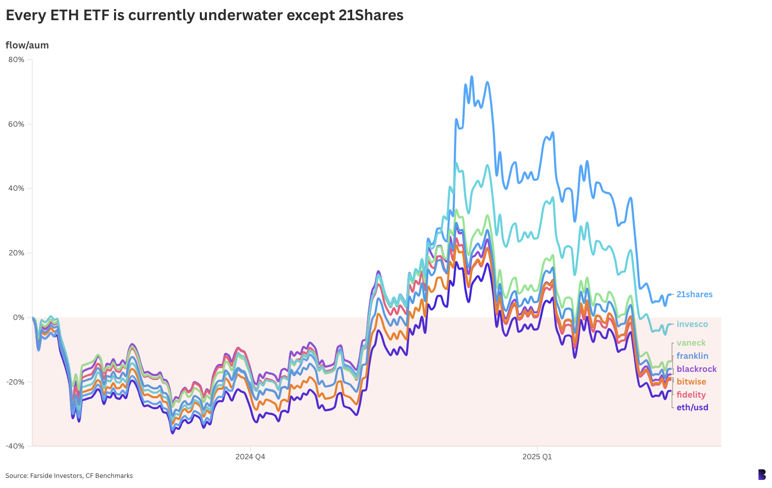 Fidelity’s FETH is the worst performer of the bunch. It’s sitting on $1.21 billion in ETH from almost $1.5 billion in net flows, so it’s down $289.2 million or just under 20%.