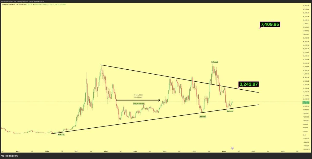At the same time, the chart points to 3,242.87 as an important resistance area near the upper boundary. If Ethereum breaks above that region and holds it, the analyst suggests the next larger upside target could extend toward 7,409.85. However, this remains a projection based on the wedge structure, not a confirmed move.