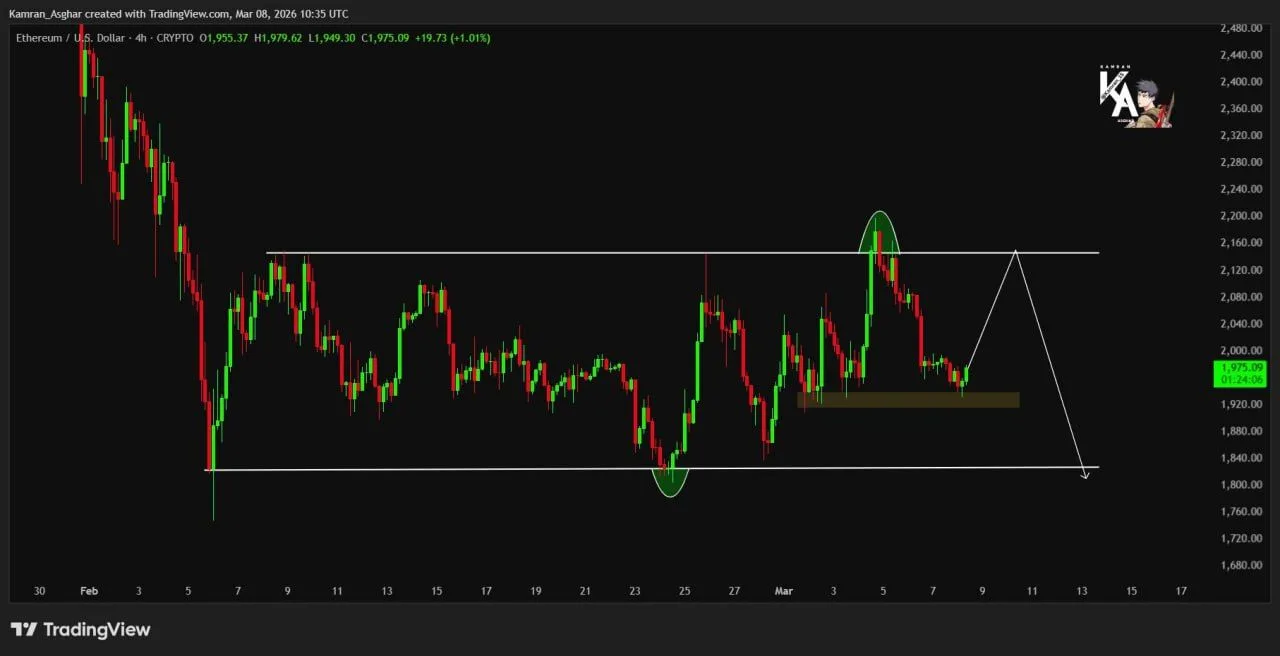 Meanwhile, Ethereum’s recent price structure shows a rejection near a key resistance band on the four hour chart shared by analyst Kamran Asghar on X. The chart outlines a horizontal range where the upper boundary repeatedly acts as resistance while the lower boundary serves as support. Each time price approaches the upper line, selling pressure appears and pushes the market back into the range.