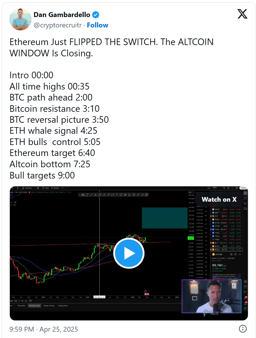 The analyst is closely monitoring the $2,700-$2,800 range as a key resistance zone for Ethereum. This price level corresponds with the apex of the triangle pattern and is a critical technical hurdle that ETH must overcome to confirm the bullish scenario.