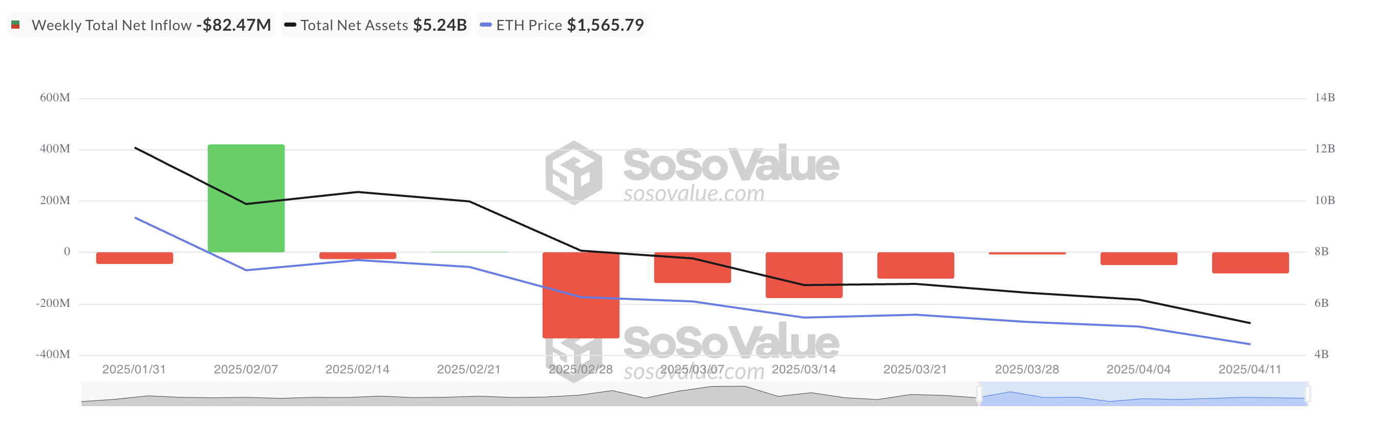 This week alone, net outflows from spot ETH ETFs totaled $82.47 million, marking a 39% surge from the $49 million recorded in outflows the previous week.