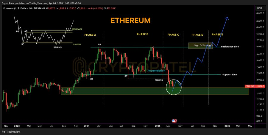 According to chart analysis shared by Crypto Patel, ETH price has passed through Phases A, B, and C of the Wyckoff pattern.