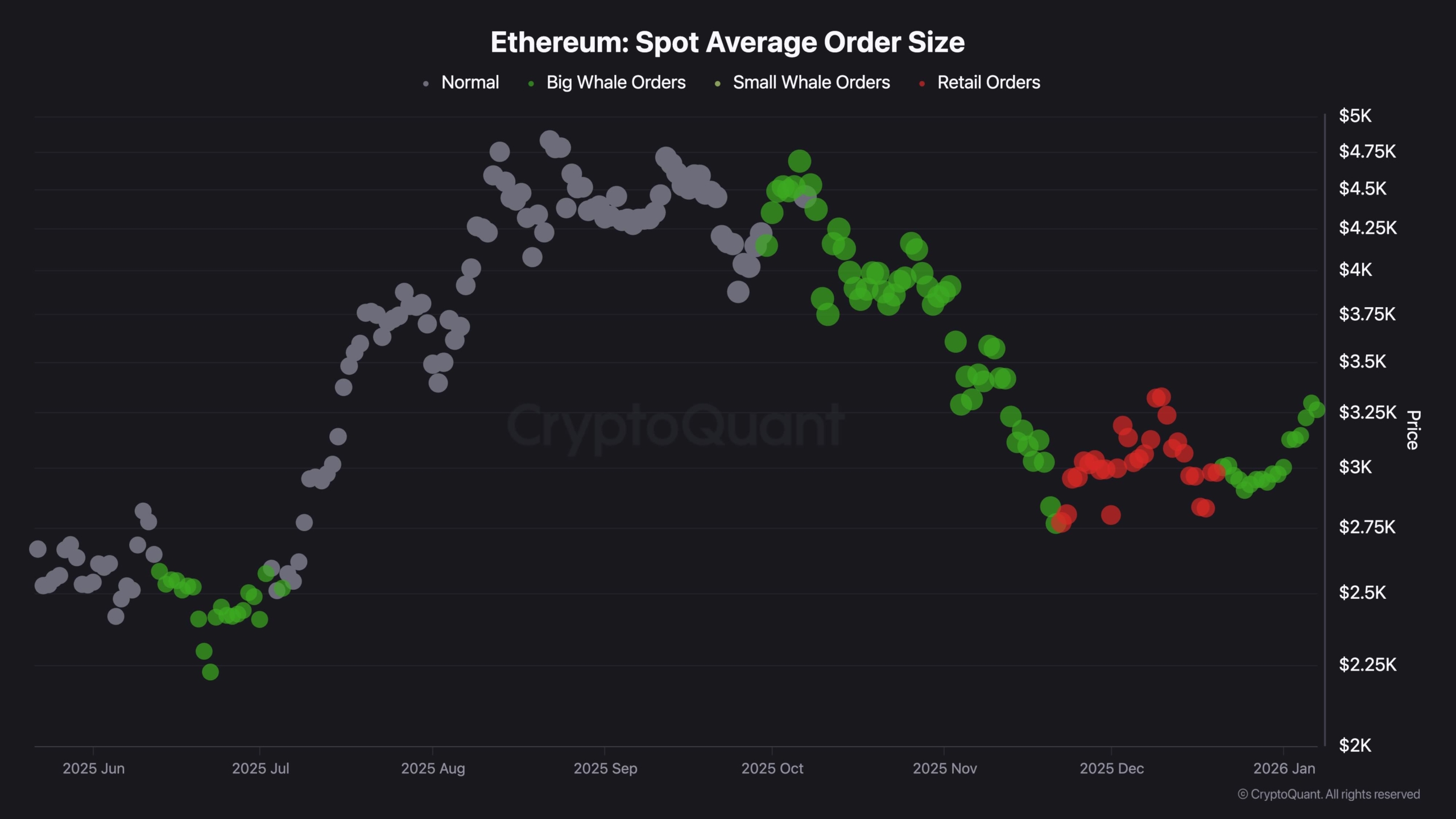 From an on-chain perspective, the Ethereum Spot Average Order Size chart shows an important behavioural shift. The recent appearance and clustering of green spots indicate increased participation from whale-sized spot buyers during the current price recovery. This suggests that larger participants are becoming active again after a period dominated by retail-sized orders.