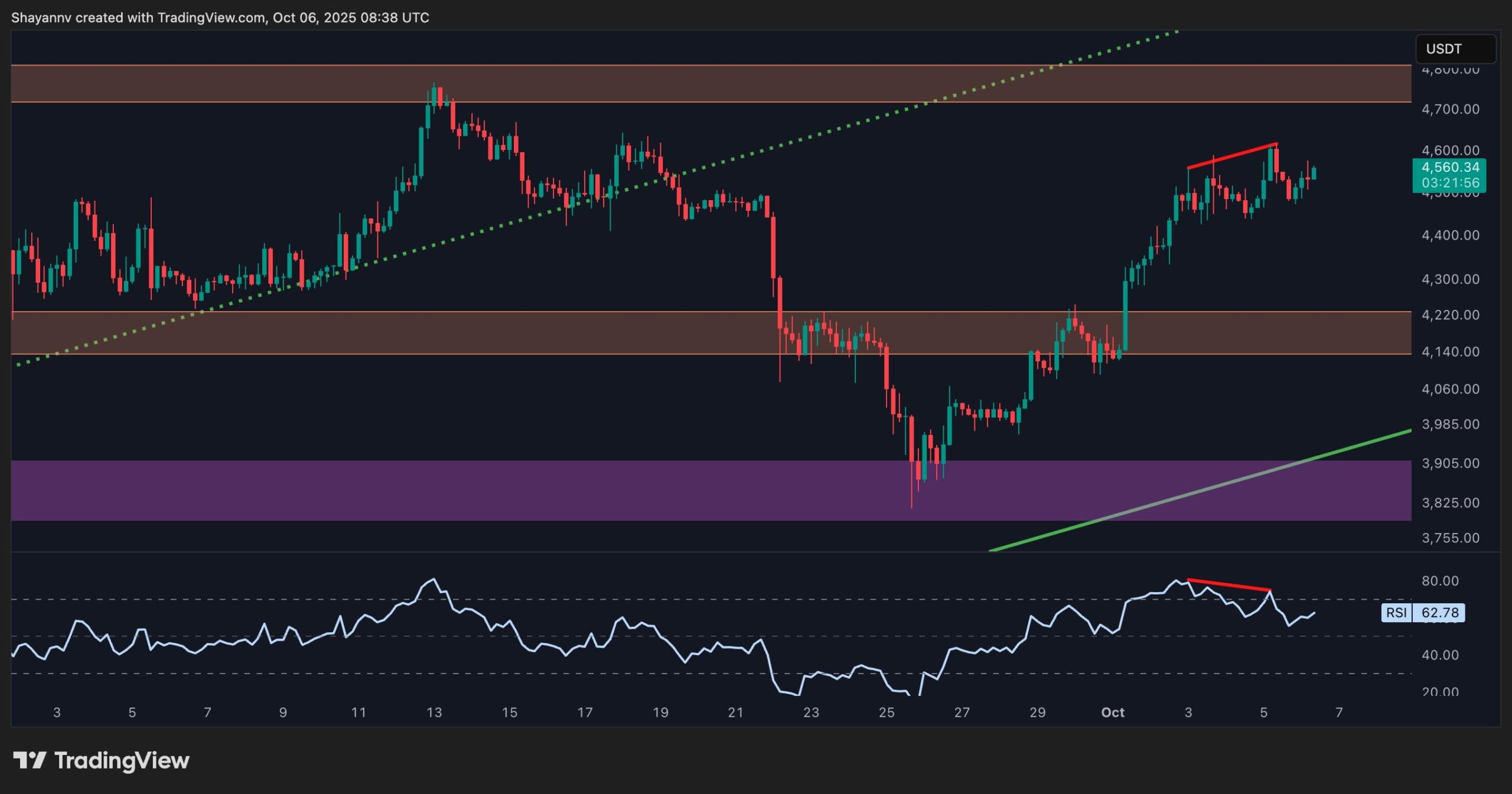 Ethereum has regained strength over the past week, rebounding and reclaiming the $4,500 zone. Momentum remains constructive, but signs of short-term exhaustion are emerging as the market approaches key resistance.