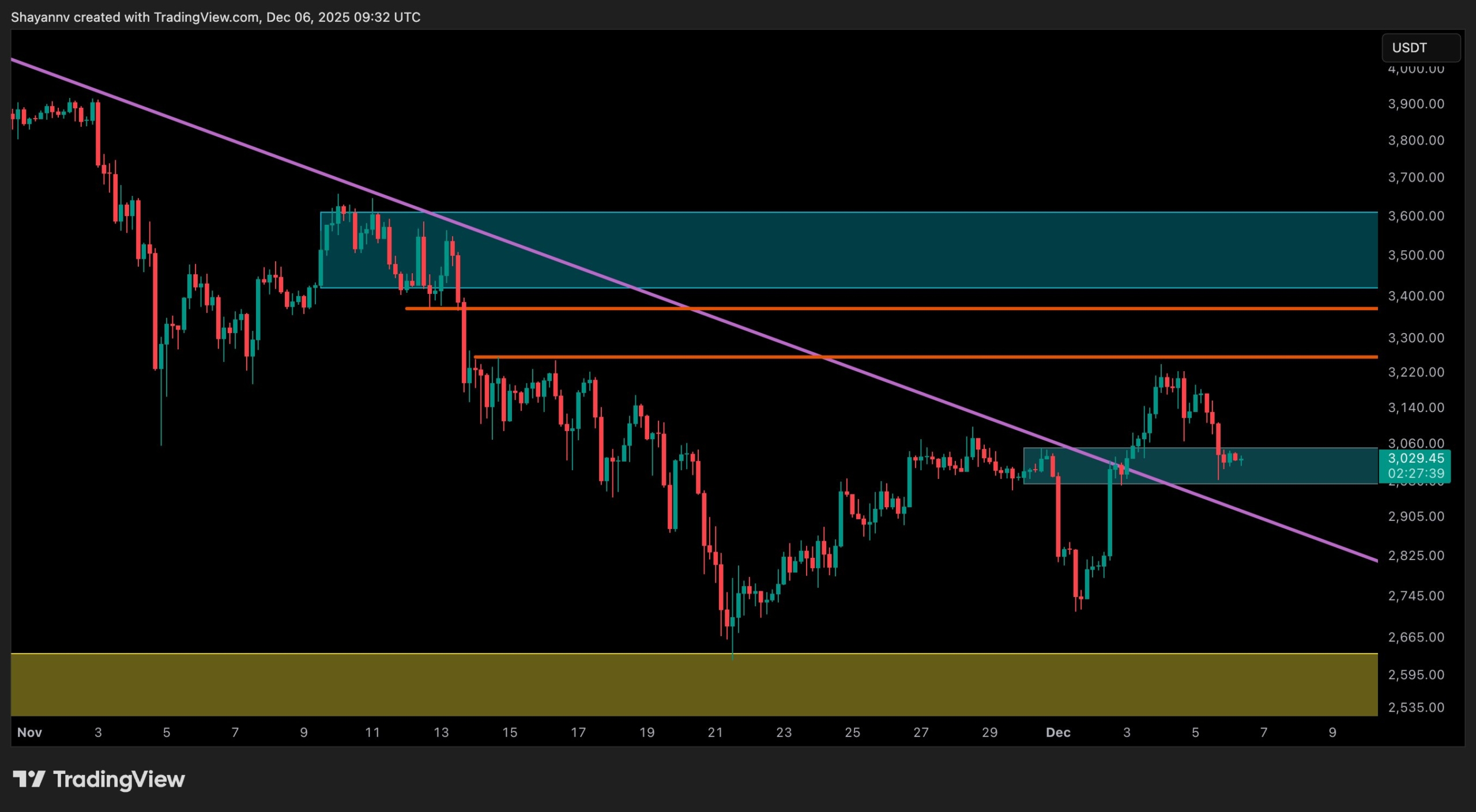 However, strong supply at the $3.2K region prompted a reversal, sending the price back toward a critical support area composed of a bullish order block overlapping a prior breaker block.