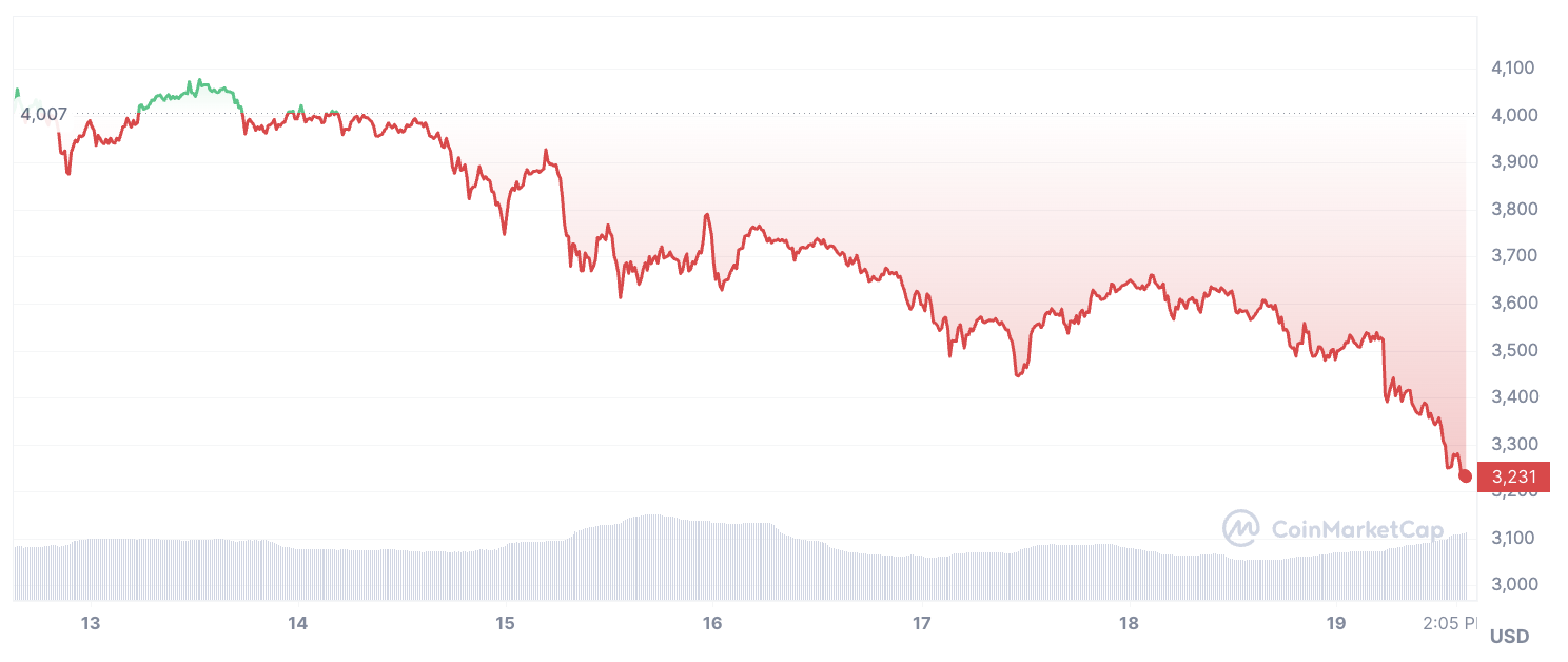 These moves come against the backdrop of Ethereum’s price plummeting over 11% since the start of the week. After reaching a two-year high of $4,093 last week, Ethereum faced a significant sell-off, driving its price down to $3,200 per ETH.