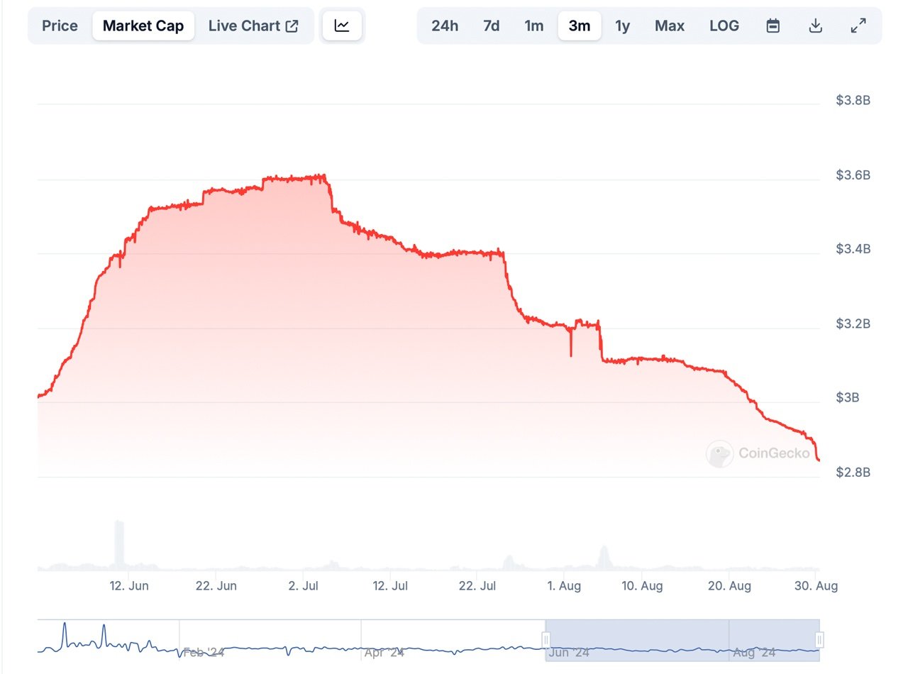 From Aug. 23 to Aug. 30, the stablecoin economy expanded from $169.72 billion to $171.08 billion. Over the past week, the fiat-linked token market saw an uptick of $1.36 billion. However, Ethena’s USDE has been on a downward trajectory since reaching its peak market cap on July 4. Back then, 3.61 billion USDE was in circulation, but since that peak, 770 million coins have been redeemed, bringing the market supply down to 2.84 billion USDE.