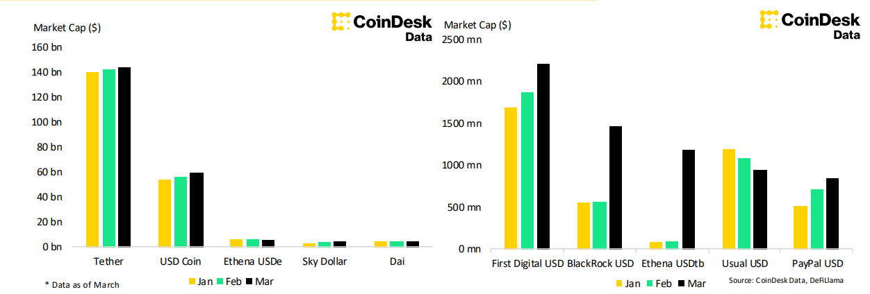 According to CoinDesk’s Stablecoins & CBDCs Report as of March 26, the market capitalization of USDtb, a synthetic stablecoin backed by BUIDL, surged 1,219% in March to $1.18 billion, making it the 8th largest stablecoin by market cap.