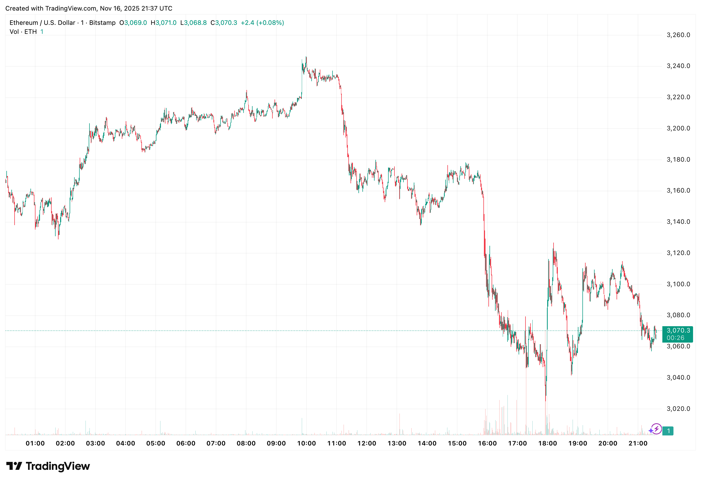 Ether ETH$3,084.23 traded below $3,100 on Sunday during a broader pullback in digital assets. The token was recently near $3,066 at 9:36 p.m. UTC, down 3.4% over the past 24 hours. It briefly fell through the $3,100 level on Bitstamp at about 4 p.m. UTC, marking its first break beneath that threshold since Nov. 4, based on data from TradingView.