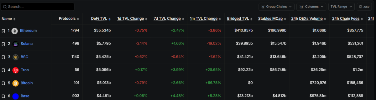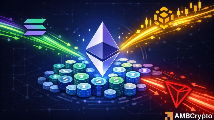 Meanwhile, Solana [$SOL], with $5.77 billion in TVL, and $BNB Chain, with $5.42 billion in TVL, support more active environments where stablecoins circulate through higher DEX volumes of $1.94 billion and $1.20 billion daily. This reflects stronger retail and trading-driven usage.