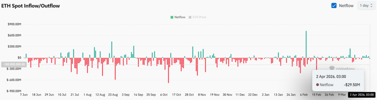 While price continues compressing, Spot Netflows remained negative, with recent data showing a $29.50M outflow.