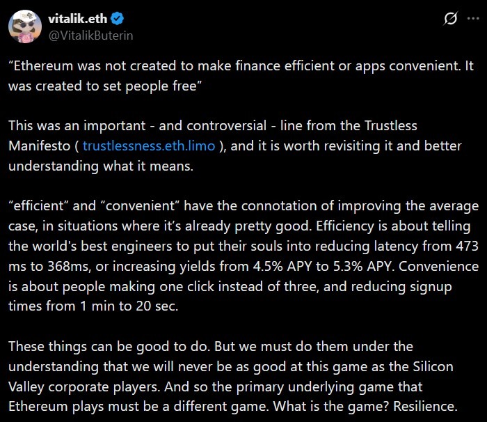 Buterin argued that Ethereum was not designed to optimize for efficiency or convenience, but to ensure that users remain sovereign even under hostile conditions.