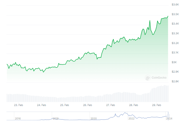 The cryptocurrency community is now eagerly anticipating the breach of the significant $3,500 price threshold, marking a potential milestone for Ethereum’s continued ascent to the highly-coveted $4,000 price tag.