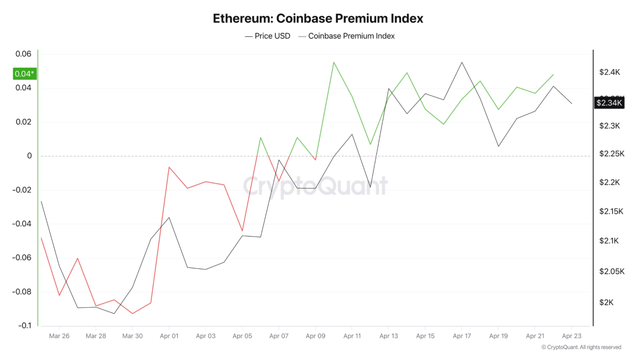 The Coinbase Premium Index, which tracks the price difference between U.S. exchanges and global platforms, shows that American investors are paying a premium to gain exposure to Ethereum, an indication of localized buying pressure.