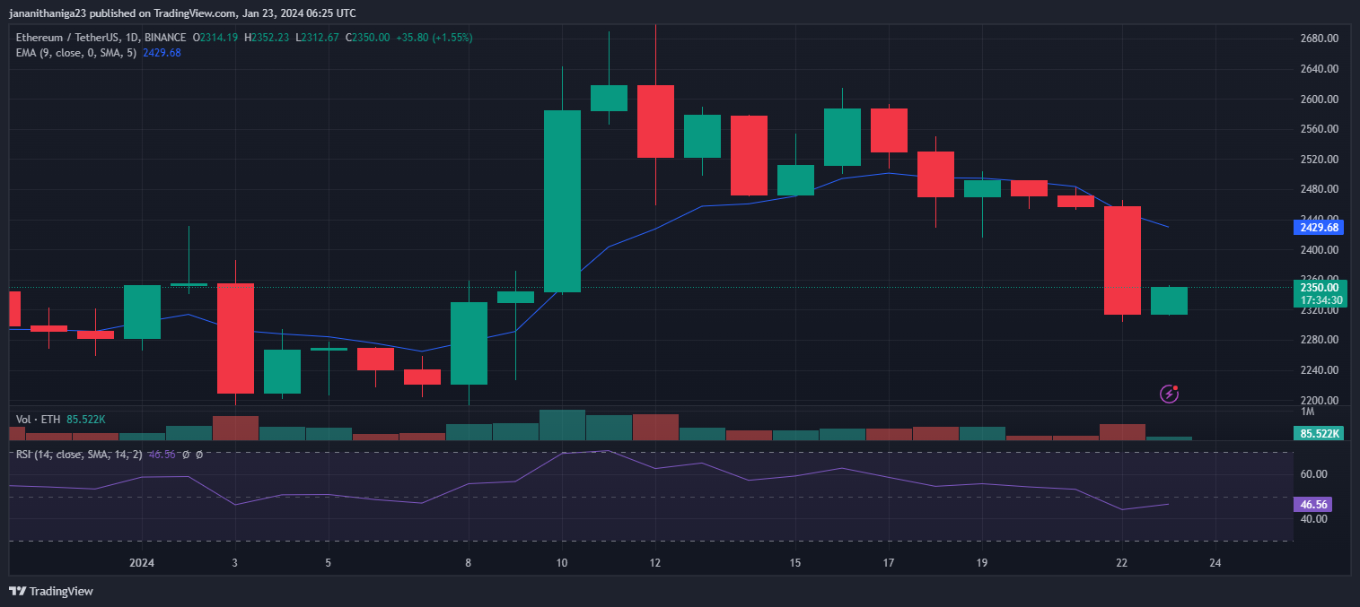 The daily chart of ETH shows a bearish trend, with the 9-day exponential moving average (EMA) currently positioned above the trading price at $2429. However, the daily relative strength index (RSI) suggests a nearly oversold condition, standing at 46.