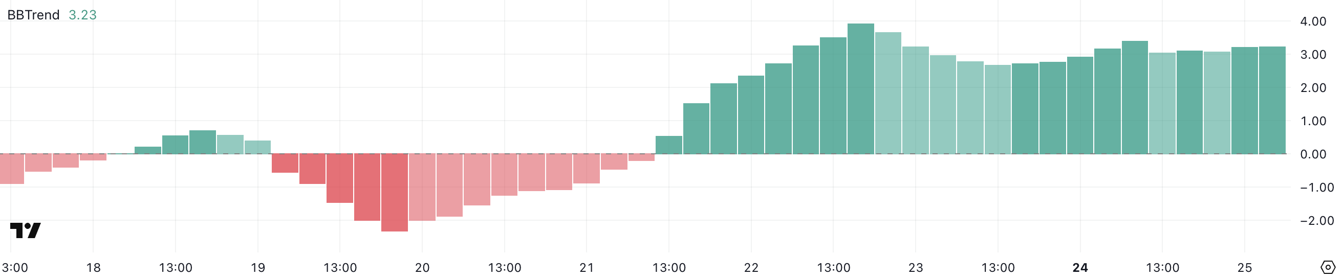Ethereum’s BBTrend hovering at 3.23 suggests some directional conviction, but the absence of readings above 5 in the past month may imply that while ETH is trending, it’s not yet in a breakout or high-momentum phase.