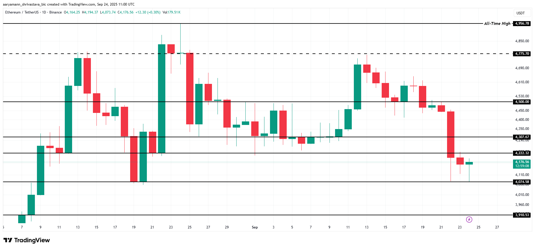 Ethereum’s price is currently at $4,176, holding just above the critical $4,074 support zone. The immediate resistance lies at $4,222, which ETH must break to attempt further recovery.