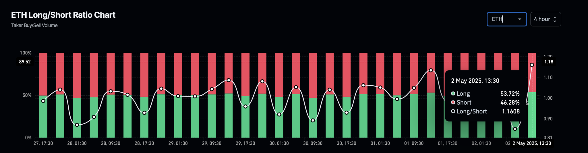 In the derivatives market, traders anticipate a major breakout rally in Ethereum. The Ethereum Long-to-Short Ratio chart shows 53.72% long positions accumulated over the past four hours.