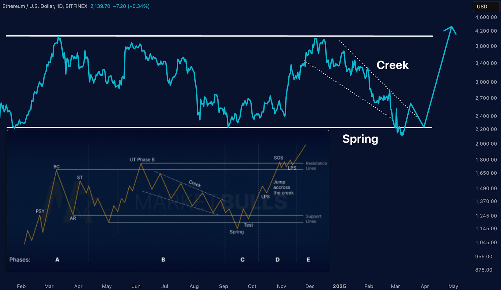 Another perspective from Merlijn The Trader points to a Wyckoff accumulation pattern. Ethereum recently hit a “Spring” phase, often seen before major breakouts. The price, currently at $2,139.70, is slightly down by 0.34%, but bullish signals remain intact.