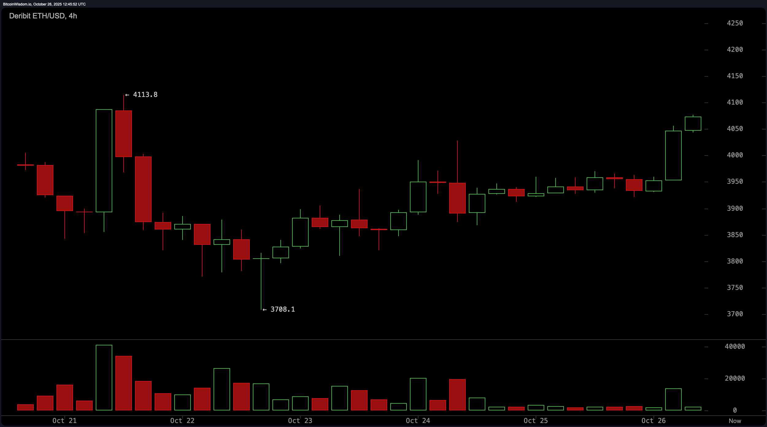 Moving averages, however, are less harmonious. The short-term exponential moving average (EMA 10) at $3,961.7 and simple moving average (SMA 10) at $3,917.3 support the upside narrative. EMAs and SMAs for 20 periods also lean positive. But once you stretch to the 30, 50, and 100-period averages, the tune changes—bearish signals reemerge. The 30-period simple moving average sits at $4,136.4 and the 50-period EMA at $4,124.2, both pointing down. This mixed bag underscores ethereum’s current dilemma: strong short-term enthusiasm facing down entrenched resistance above.
