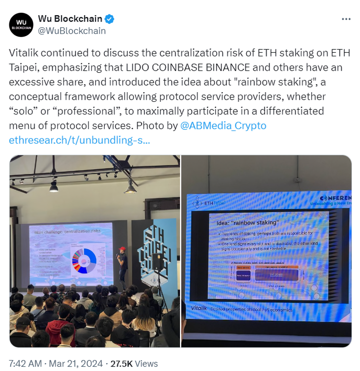 Ethereum Founder Vitalik Buterin introduced a novel concept called “rainbow staking” during the ETHTaipei 2024 event in Taiwan. Colin Wu, a Chinese reporter, shared an X post on his Wu Blockchain page, giving insights on Buterin’s rainbow staking project.