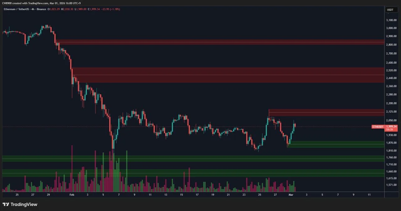 According to CW8900, a breakout above $2,125 is essential for further upward movement. If buyers push through that resistance and hold above it, the next supply region sits higher near the mid $2,400 area. However, if the sell wall holds, Ethereum could face renewed pressure and remain inside the broader range marked by lower support zones.