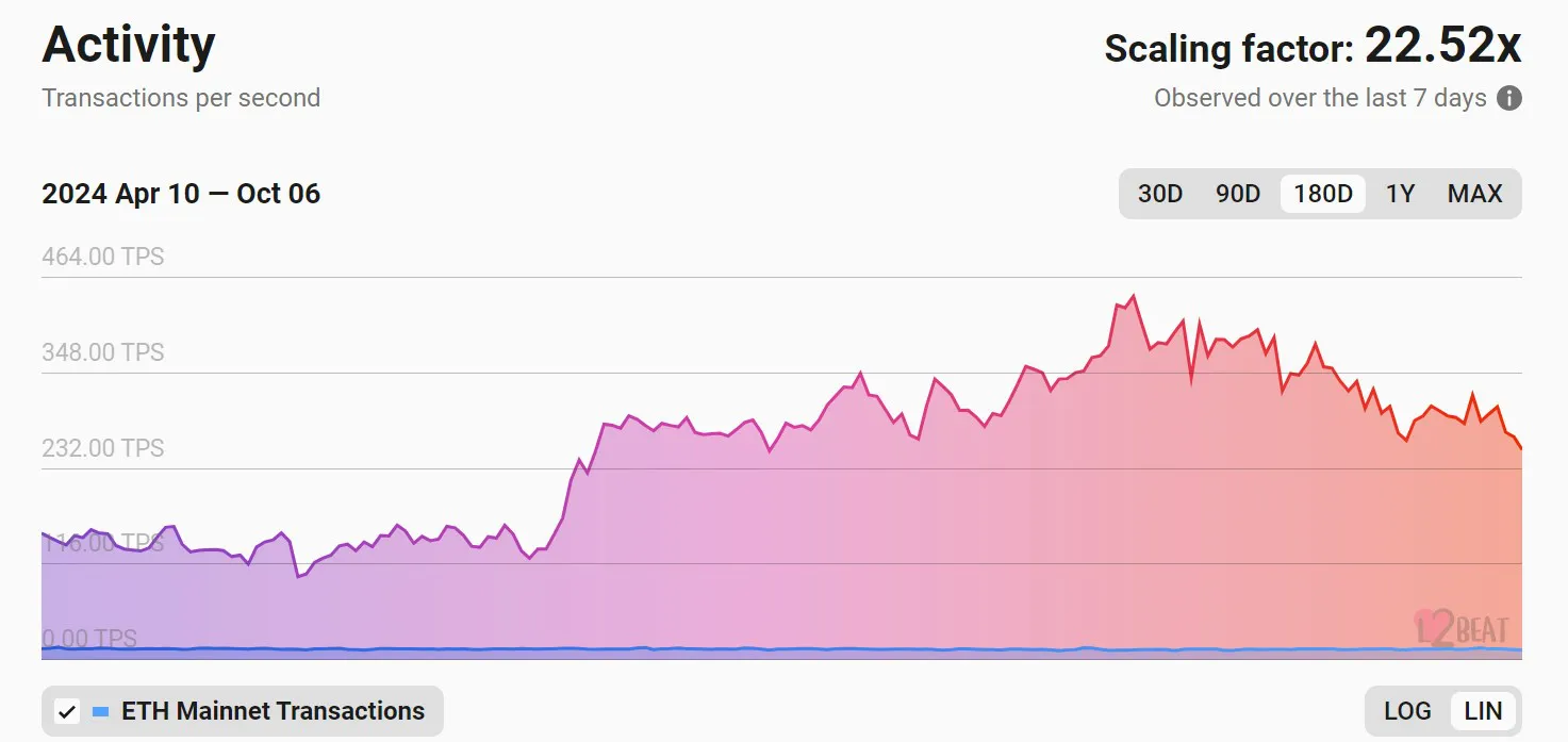 Despite the decline in throughput for all Ethereum scaling solutions, Base remains a notable outlier. On October 4, the network saw a record high of over 66 TPS, highlighting its higher transaction count and speed.