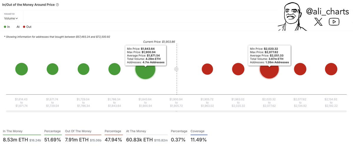 Top analyst Ali Martinez recently shared on-chain metrics, identifying $1,870 as Ethereum’s strongest support level. This means that if ETH breaks below this zone, a further decline could be imminent. On the upside, $2,050 is now Ethereum’s most challenging resistance, acting as a crucial barrier that bulls must overcome.