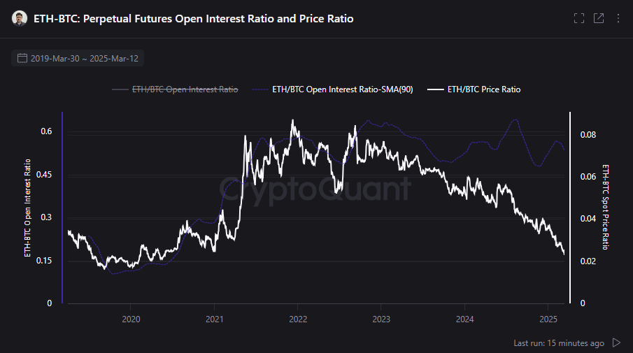 CryptoQuant analyst SunflowrQuant pointed out that Ethereum has been losing ground against Bitcoin for two years. The ETH/BTC ratio has dropped to 0.02, and open interest in Ethereum futures has fallen to 0.15, suggesting traders are shifting their focus toward Bitcoin.