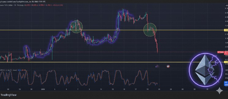 - Next Support Floor: The immediate horizontal support is visible at $2,900 (indicated by the lower yellow line). If ETH fails to stabilize here, the doors open for a deeper correction toward the $2,700 demand zone.