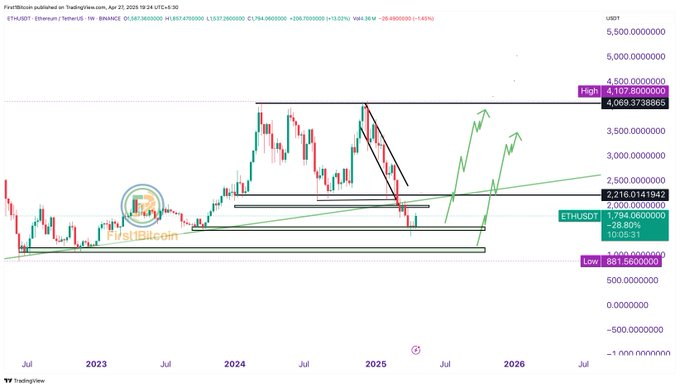 Over the past two months, ETH’s weekly chart shows a falling wedge pattern. In crypto, this setup often signals a reversal. Traders look for a break above the wedge’s upper line. A strong increase in volume on that breakout would confirm the pattern and point to higher prices.