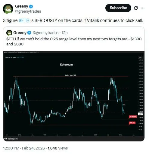 Also, Ethereum is testing the lower end of a long-running range on the multi year ETHUSD chart, as analyst Greeny warned that a breakdown could open room for a deeper move lower. In a post on X, Greeny said $ETH has “three figure” risk if it cannot hold the 0.25 range level. Greeny also tied that risk to what he called continued “click sell” behavior by Vitalik Buterin, without providing onchain proof in the post.