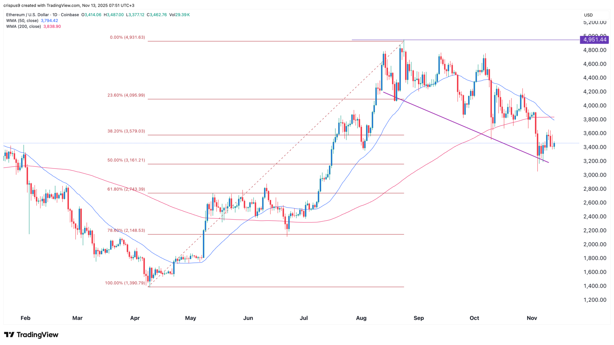The daily timeframe chart shows that the price of Ethereum has been in a strong downward trend in the past few months, moving from a high of $4,950 in August to $3,473 today.