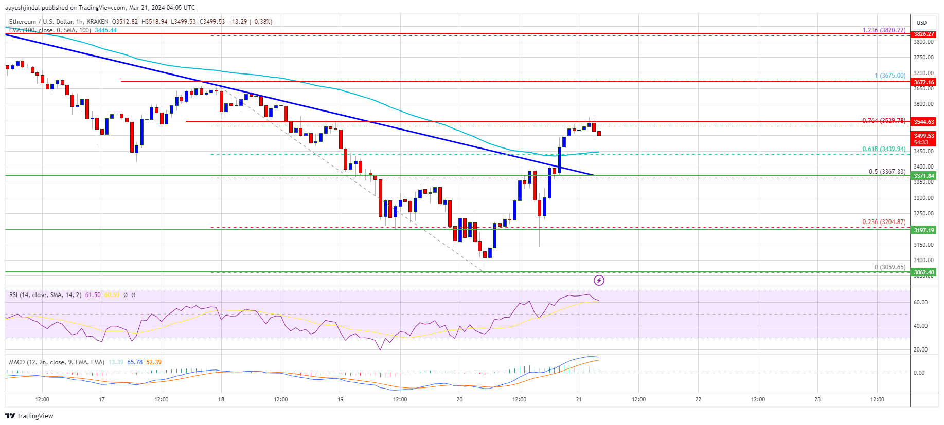A low was formed at $3,059 and the price is moving higher. There was a strong recovery wave above the $3,350 resistance. The price cleared the 50% Fib retracement level of the downward wave from the $3,675 swing high to the $3,059 low.
