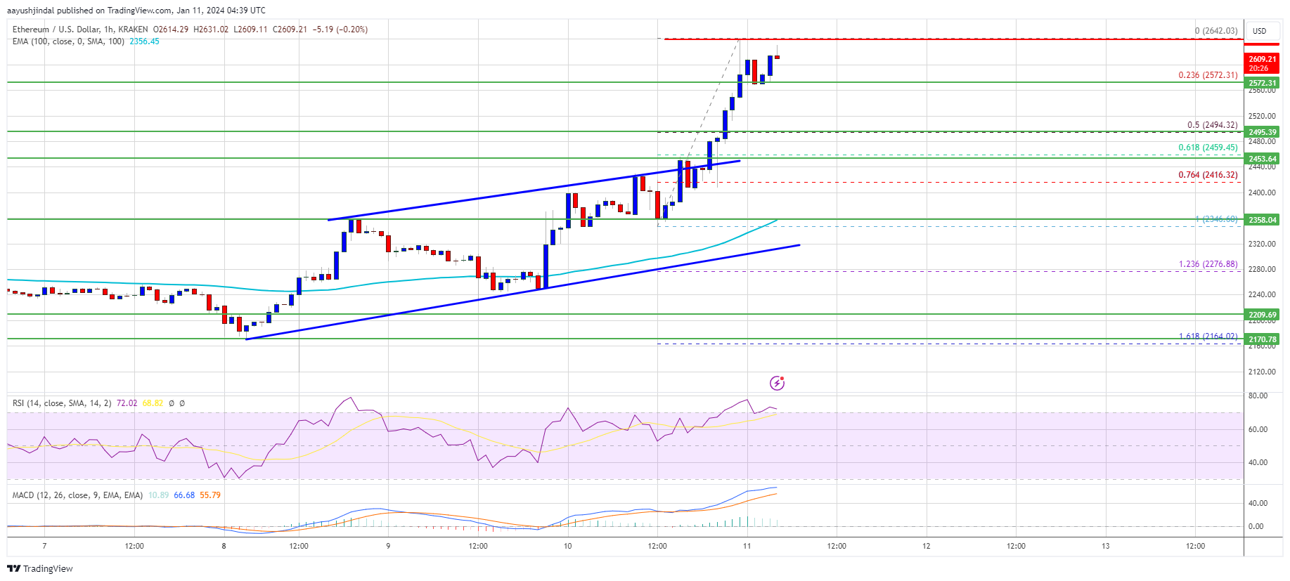 There was a break above a key rising channel with resistance near $2,440 on the hourly chart of ETH/USD. The pair surged over 5% and even cleared the $2,500 resistance zone. There was a spike above the $2,600 resistance zone. A new multi-week high was formed near $2,642 and the price is now consolidating gains.