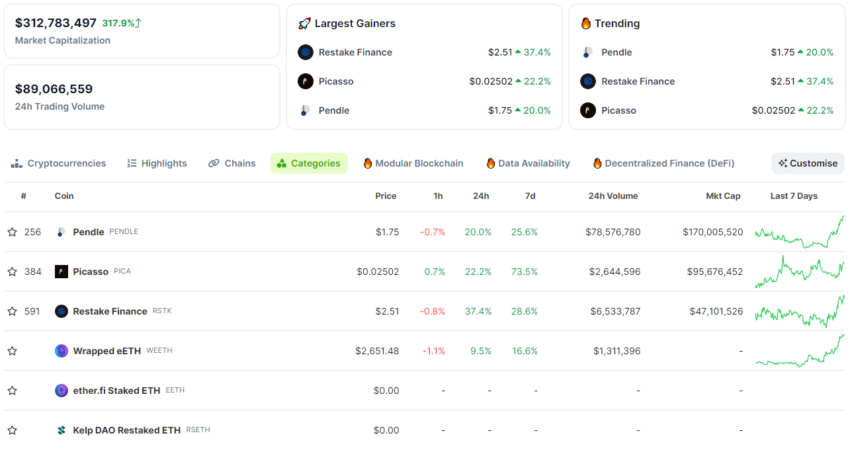 According to the new CoinGecko category, the restaking market capitalization is around $300 million. It currently only lists a few restaking platform tokens, but they have surged in price over the past 24 hours.