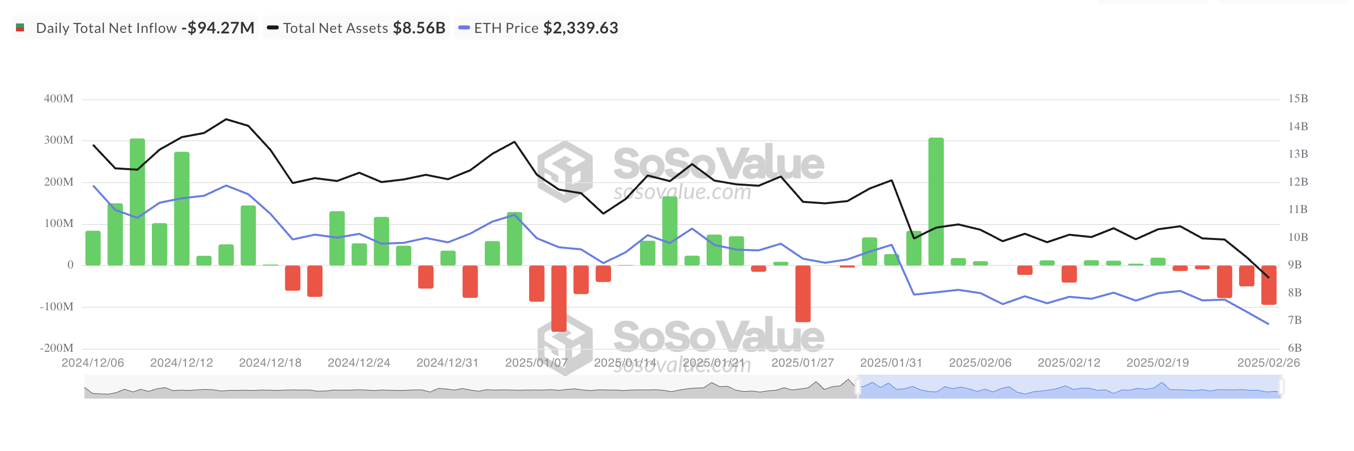According to data from SosoValue, net outflows from ETH spot ETFs climbed to a 30-day high of $94.27 million on February 26. This marked the third-highest single-day net outflows since the beginning of the year, and it followed the coin’s price decline to an intraday low of $2,251.