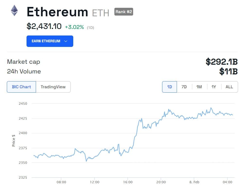 ETH prices have ticked up 3% over the past 24 hours to reach $2,431 during the Thursday morning Asian trading session.