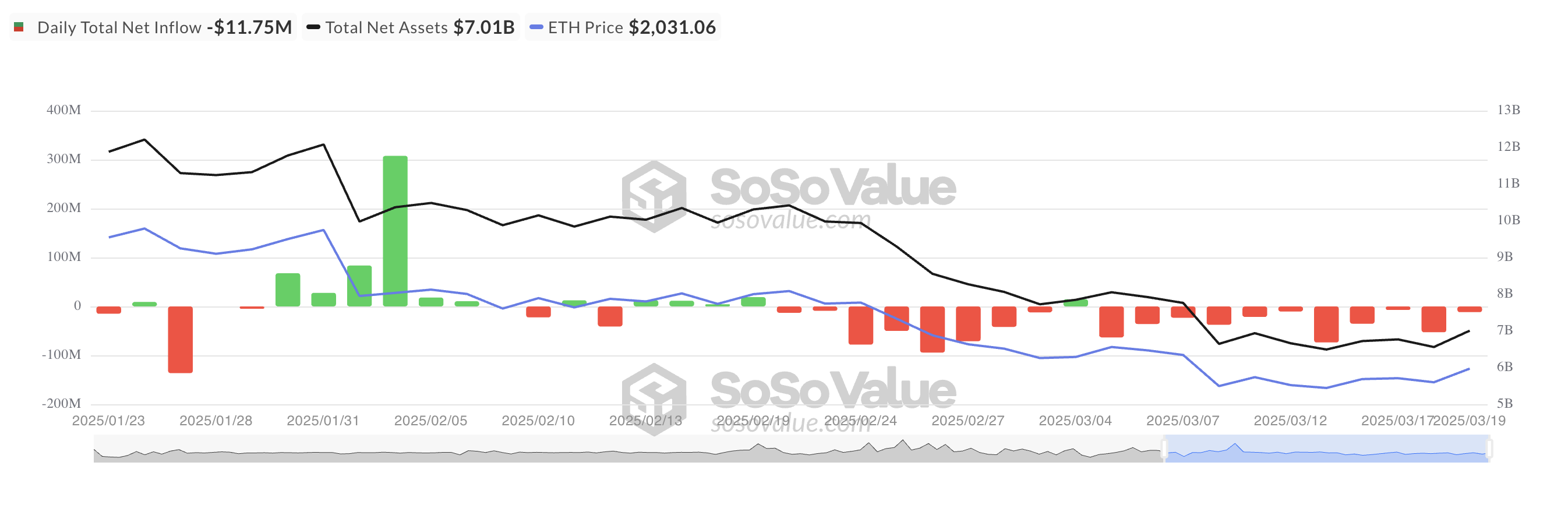 This extended price decline has rattled investor confidence, leading to consistent capital outflows from spot ETH exchange-traded funds (ETFs) since the start of March.