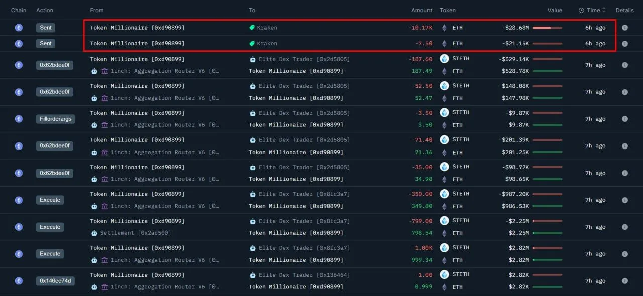 An Ethereum whale moved 10,176 ETH, worth about $28.69 million, to Kraken after unwinding a large stETH position, on-chain data shows. The address converted the staked ETH (sETH) back to ETH, then sent the full stack to the exchange in two large deposits.