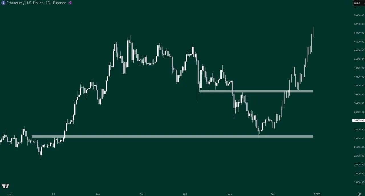 Ethereum’s chart shows a decisive breakout after reclaiming two major horizontal zones that capped price action through the second half of the year. The move above the first resistance near the 3,000–3,100 USD area shifted momentum, while the clean push through the 3,600–3,700 USD band confirmed strength and removed the last major supply block before higher targets.