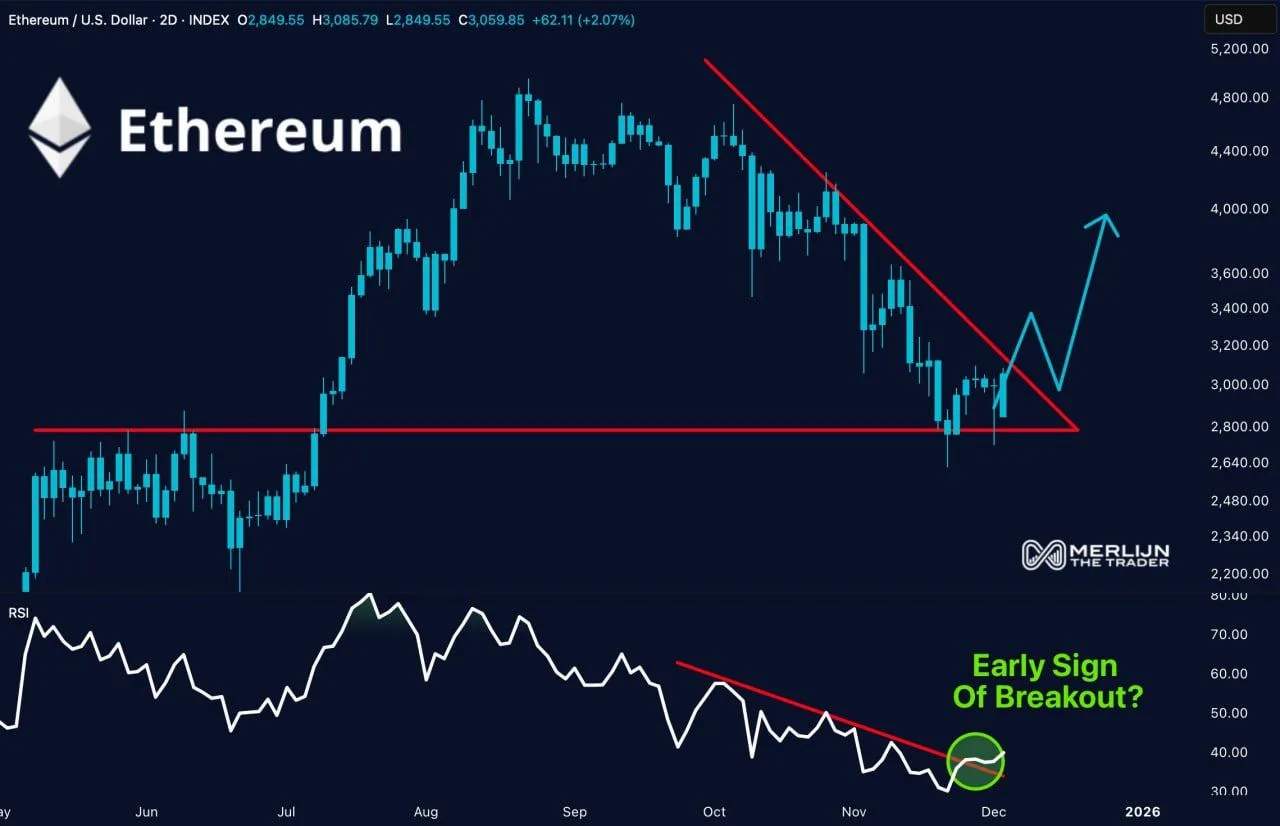 Meanwhile, Ethereum chart from trader Merlijn shows momentum indicators turning higher even as price trades inside a tight triangle. On the two-day ETH/USD view, candles cluster just above horizontal support while a descending trendline caps recent highs, forming a compression zone.