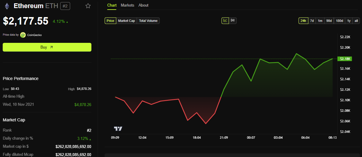 BeInCrypto data shows that Ethereum’s price has risen by over 4% in the past 24 hours. As of this writing, ETH was trading for $2,177.