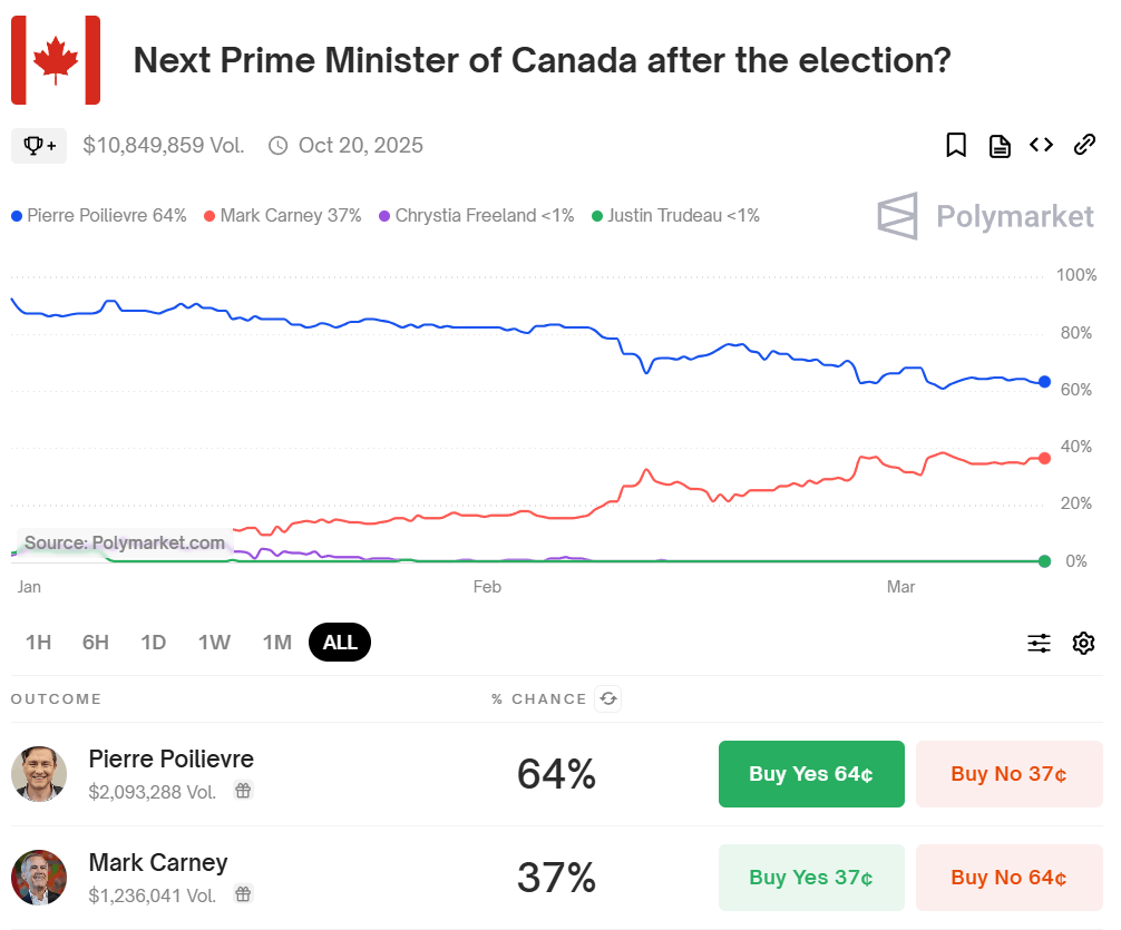 (Conservative Party Lead Pierre Poilievre is still heavily favored to win the Prime Minister nomination in Canada’s next general election / Polymarket)