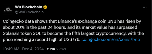 According to Coingecko data, Binance’s native token, BNB, has surged by approximately 20% in the past 24 hours. The rally pushed its market cap past Solana’s SOL, moving its previous position to become the fifth-largest crypto by market cap.