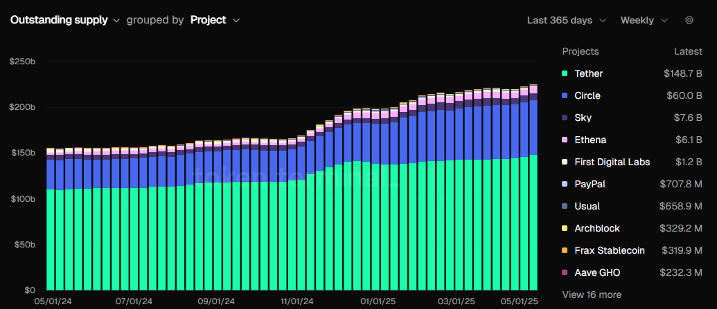 CoinMarketCap lists over 200 stablecoins, while CoinGecko tracks more than 300. Data from Token Terminal shows that the stablecoin market cap has surpassed $225 billion, issued by over 50 entities. However, Tether and Circle still dominate most of that market cap.