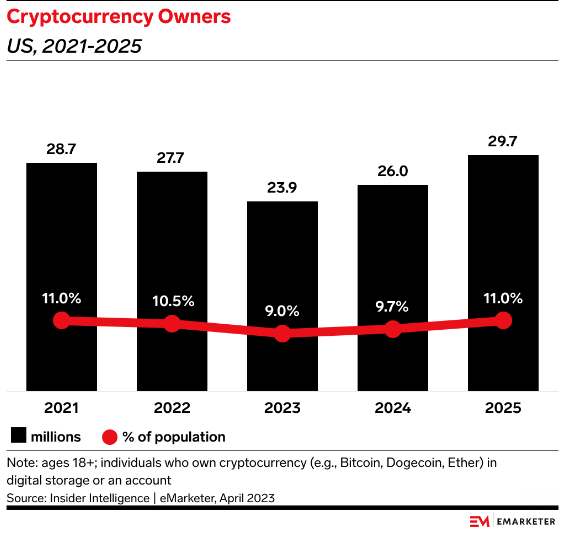 So much so, in fact, that EMARKETER has a bold new prediction: that the number of Cryptocurrency owners in the US will reach 26 million in 2024, and 29.7 million in 2025.