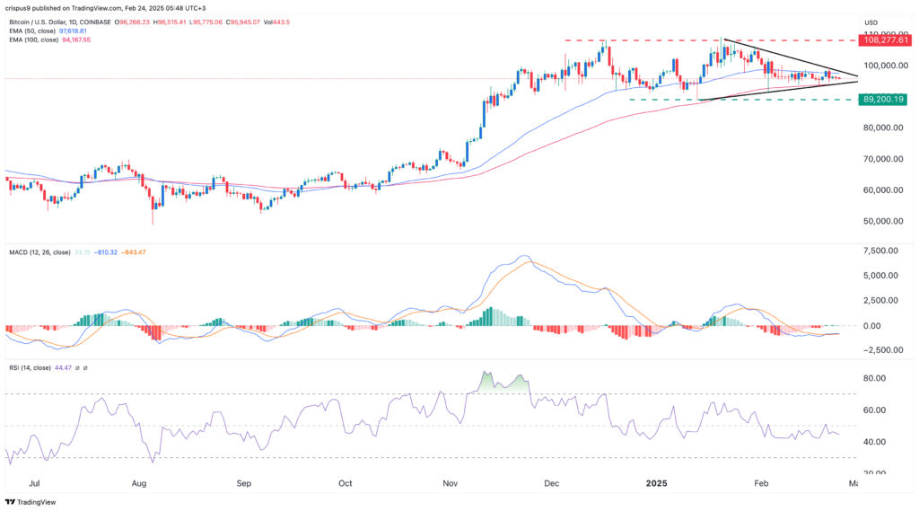 Turning to the daily chart, we see that Bitcoin has been in a tight range since November last year when it jumped to $108,277. It has formed a double-top pattern at that level whose neckline is at $89,200. A double-top is one of the most bearish patterns in technical analysis since it signals that bulls are afraid of placing bets above that price.